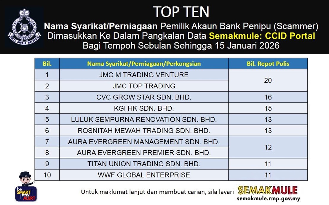 Pada hantaran itu, JSJK turut memaparkan nama syarikat atau perniagaan pemilik akaun bank yang dimasukkan ke dalam 10 teratas pangkalan data Semakmule CCID dalam tempoh sebulan sehingga 15 Januari.