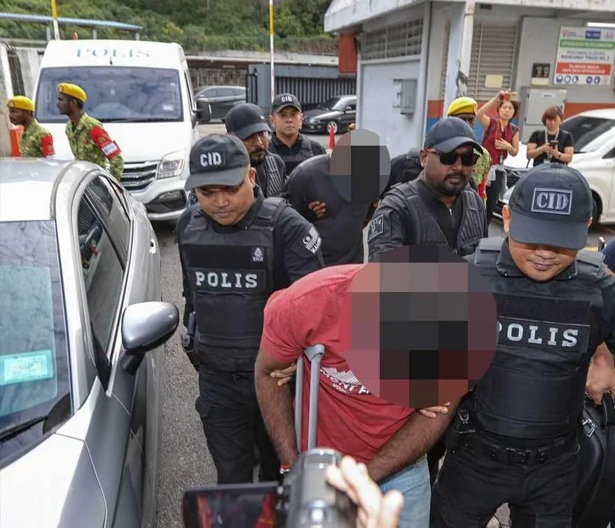 Suspek yang dipercayai mempunyai hubungan sebagai rakan kepada dua mangsa dewasa dilihat memakai pakaian biasa dengan tangan bergari secara berasingan.