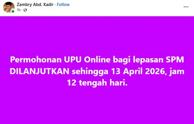 “Saya ingin membuat pengumuman penting yang baru saja kita dapat kebenaran awal pagi tadi, saya diminta untuk memaklumkan bahawa dengan sukacitanya Menteri Pendidikan Tinggi bersetuju bahawa tarikh tutup permohonan UPU Online bagi lepasan SPM yang dijadualkan pada esok 12 April jam 5 petang dilanjutkan kepada 13 April iaitu Isnin, jam 12 tengah hari.