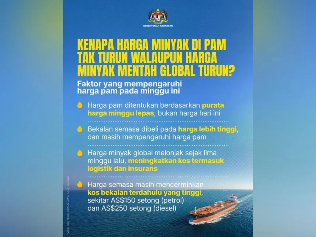 “Harga semasa masih mencerminkan kos bekalan terdahulu yang tinggi, sekitar AS$150 setong (petrol) dan AS$250 setong (diesel),” menurut hantaran itu.