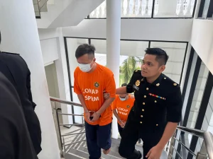 PENGARAH syarikat diiringi pegawai SPRM untuk mendapatkan perintah reman bagi membantu siasatan kes rasuah di Mahkamah Tinggi Ipoh, Perak pagi ini. GAMBAR: SPRM