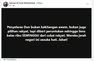 Sementara itu, dalam kenyataan berasingan di media sosial, Salman Al Farisi mendakwa, penyelaras DUN menerima peruntukan sehingga RM15,000 seminggu yang disifatkan sebagai pembaziran dan merampas hasil negeri, selain mengaitkannya dengan isu kos sara hidup rakyat yang meningkat.
