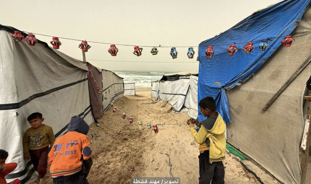 Walaupun banyak keluarga masih tinggal di dalam khemah akibat kemusnahan kediaman, mereka tetap menghias tempat perlindungan dengan lampu dan tanglung sebagai simbol harapan dan usaha mengekalkan tradisi.