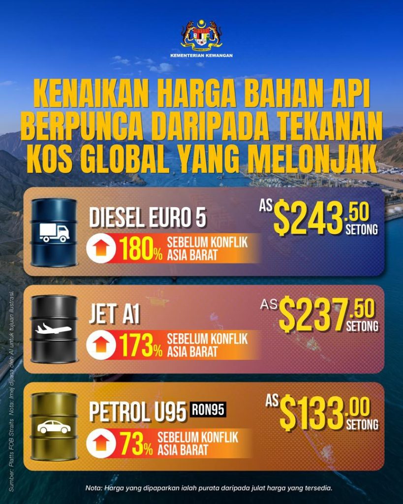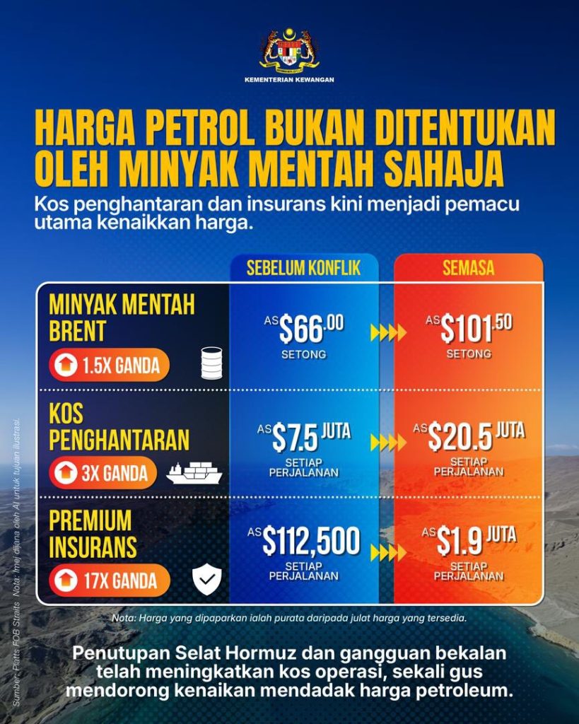 LONJAKAN harga petroleum hari ini bukan berpunca daripada kenaikan harga minyak mentah semata-mata, sebaliknya konflik di Asia Barat telah meningkatkan risiko terhadap rantaian bekalan petroleum global, sekali gus melonjakkan kos penghantaran dan premium insurans.