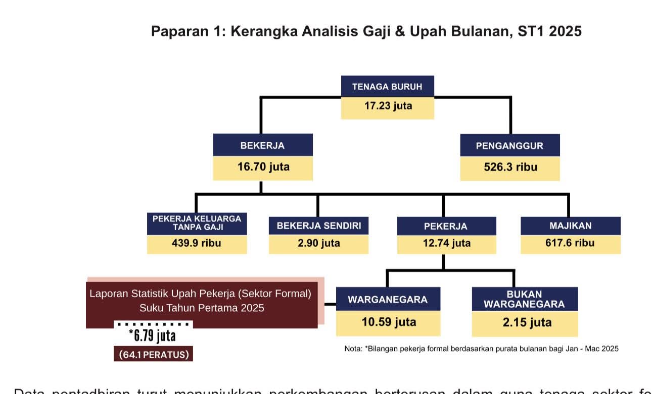 Kita lihat Laporan Statistik Upah Pekerja (Sektor Formal) suku pertama 2025.  Sekitar 6.79 juta warga negara Malaysia bekerja dalam sektor formal. Upah bulanan penengah untuk kumpulan ini ialah RM3,000.